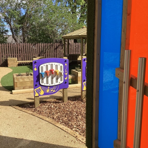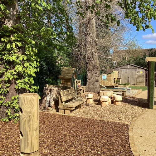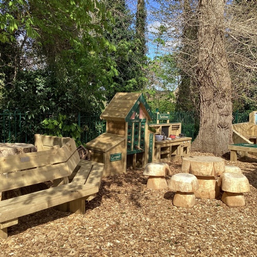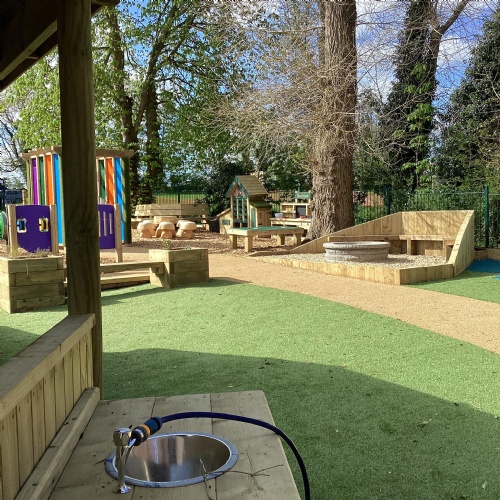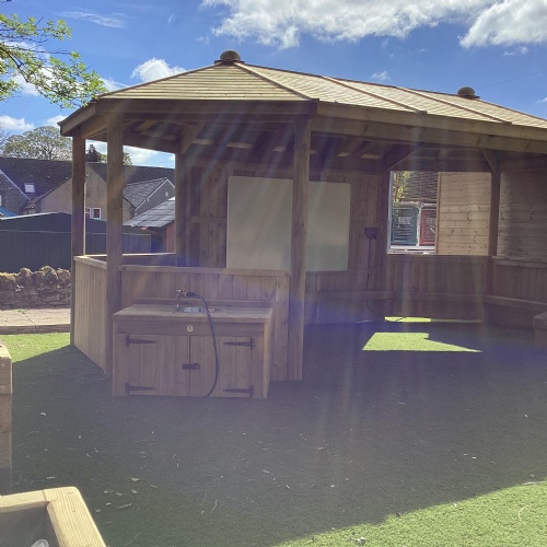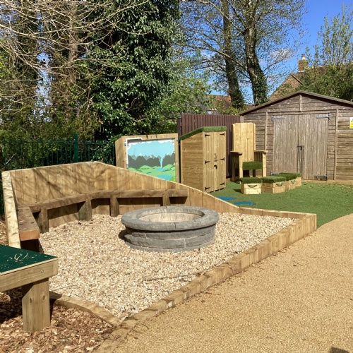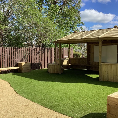 Based as we are, in the heart of the countryside, we love to take our learning outside whenever possible. Provision in this area has recently been enhanced with the development of a fabulous new "Outdoor Learning Zone", which adjoins our existing nature and pond gardens. The new area provides an amazing space for den building, water play, exploring nature and letting our imaginations run wild in the story teller chair. It is also a good space in which to "chill", with the gentle sounds of the chimes in the music area, or enjoying the sensory garden in our wooden planters. Raining? No problem - we have a spacious shelter to work in. (Or we might just get a bit wet!)