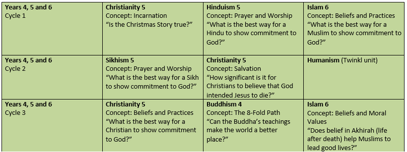 Our R.E. curriculum is delivered using a scheme called "Discovery R.E.". This scheme takes a "big question" approach to teaching, and covers all major world religions. The table below shows how this works. From time to time we may select different questions to explore - there are many units of work to choose from so this is just a representative selection.