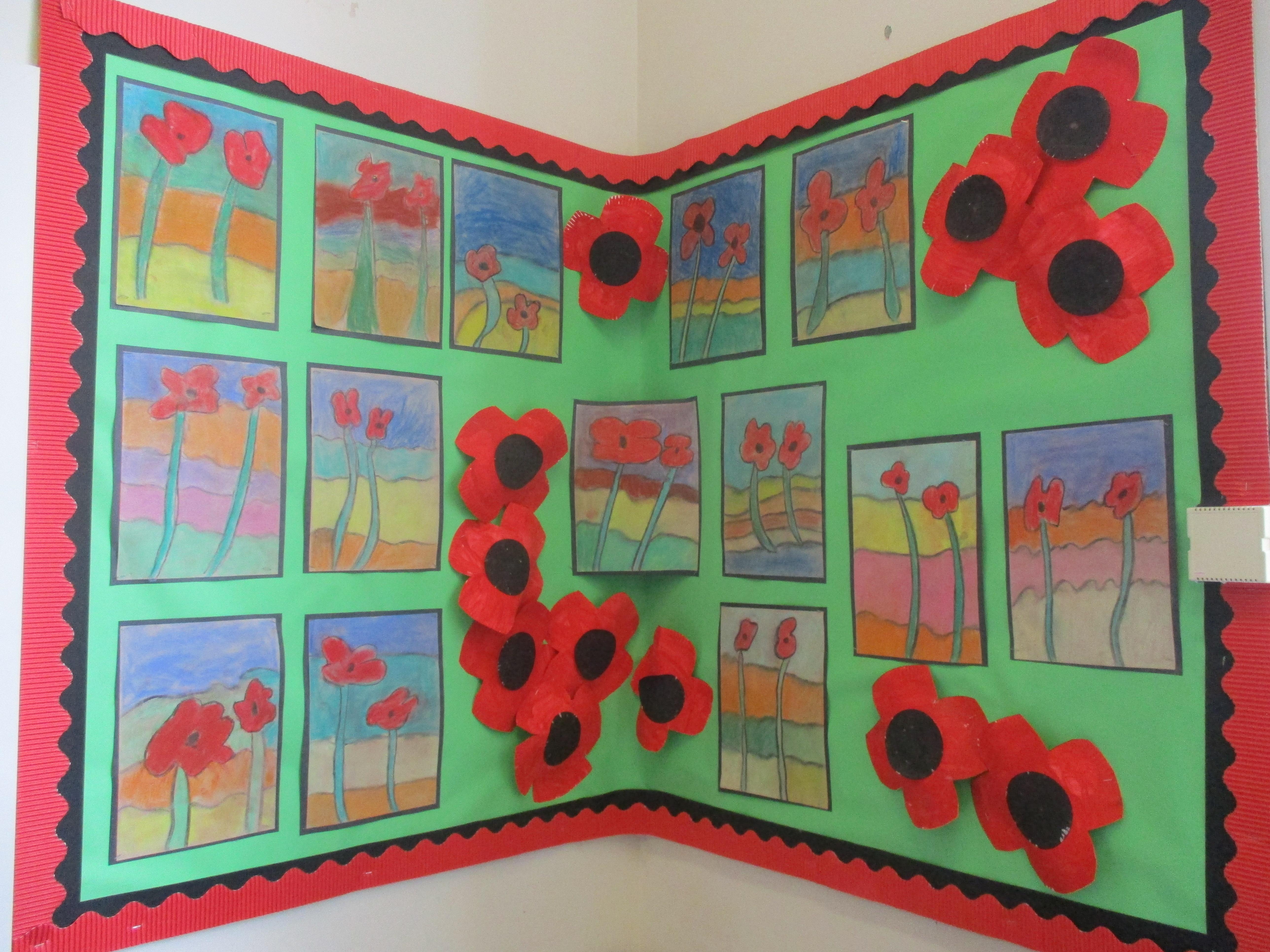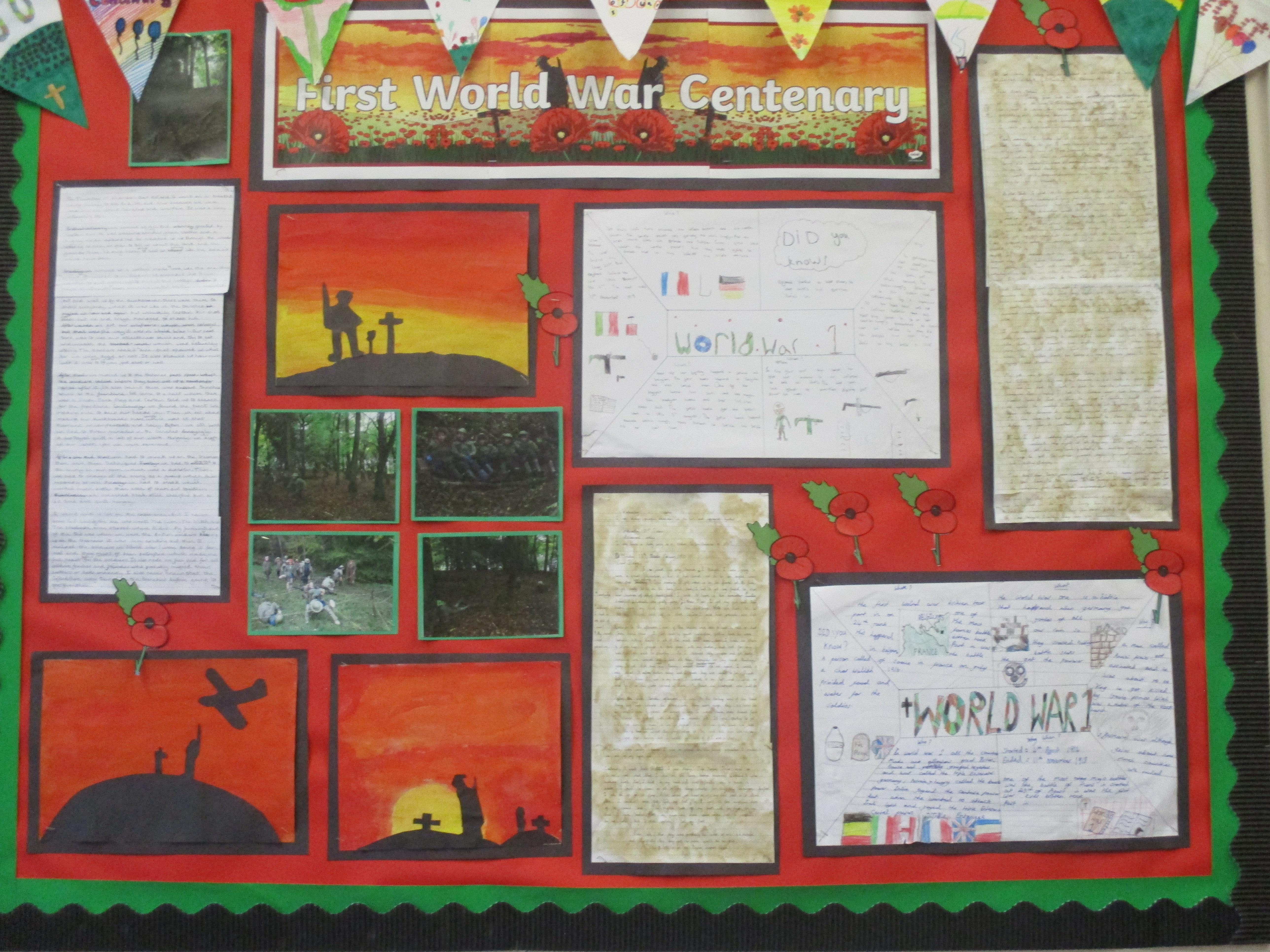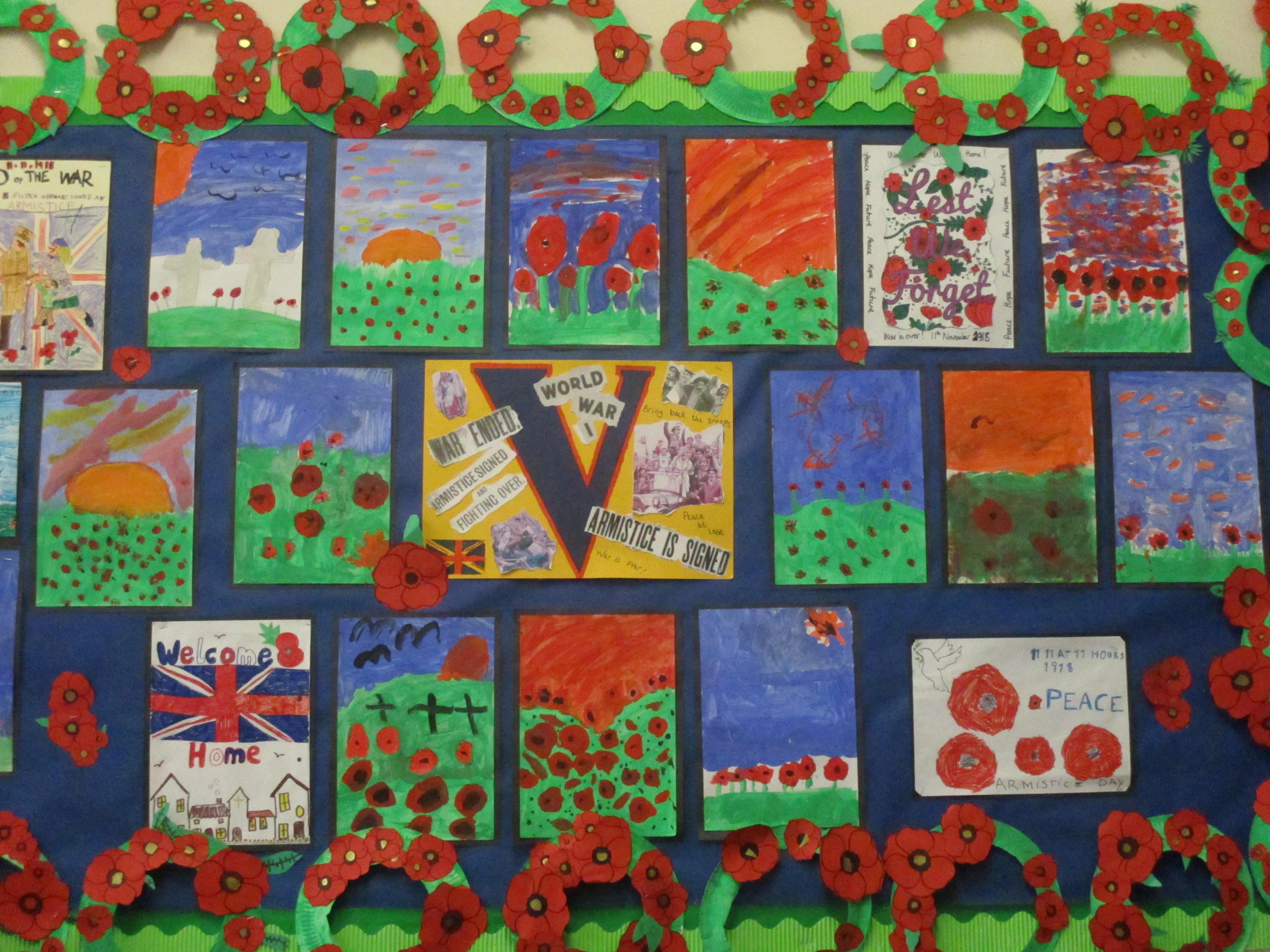 In November 2018 we spent a week thinking about and commemorating the end of World War One - "The Great War". Each class took part in activities to help us to understand more about WW1 and the importance of remembrance events. Years 4 to 6 took part in a trenches experience day at Hill End and all classes participated in sessions using virtual reality headsets and software, which enabled us to make virtual journeys around the trenches and the dug-outs. Our older pupils looked at poetry written by some famous war poets, whilst younger pupils focused on life at home 100 years ago, comparing it with our lives today. All classes produced some fabulous art work using commemorative poppies as their inspiration and we planted bulbs in our school garden, which we look forward to seeing bloom in the spring. Our special week ended with a centenary celebration meal, including bacon "clangers" and seasonal vegetables, which we ate "street-party style" complete with bunting and period music. Here are some photographs from our week.